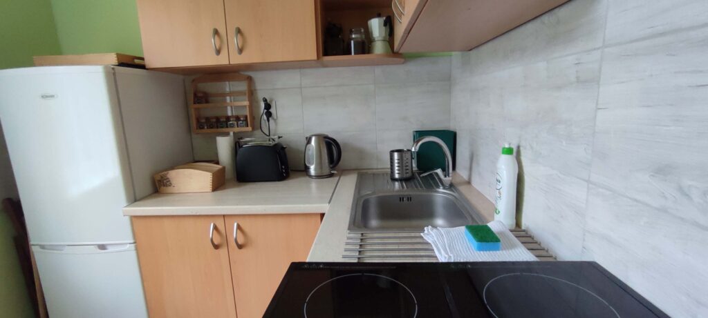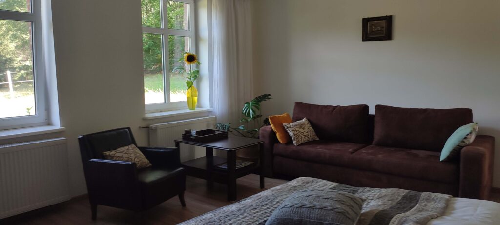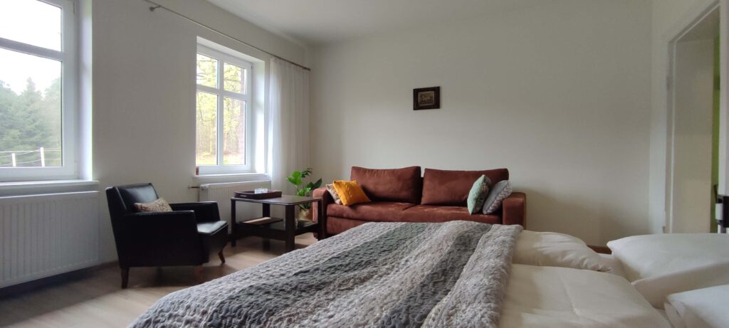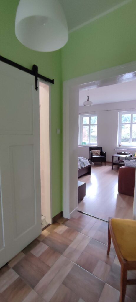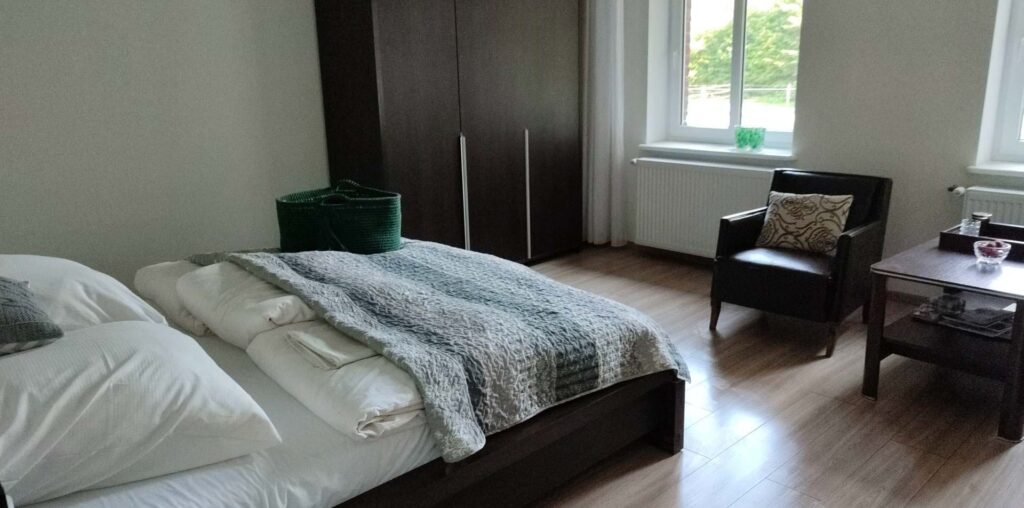 W apartamencie staraliśmy się zachować klimat domu w lesie, jednocześnie zapewniając podstawy komfortu nowoczesnego wnętrza. Jest mała łazienka, wyposażona kuchnia i duża, 22m2, sypialnia z dwoma dużymi oknami. W sypialni jest jedno podwójne łóżko i rozkładana kanapa. Po rozłożeniu kanapy jest jeszcze dużo miejsca na łóżeczko turystyczne czy legowisko psa. Całość jest położona na parterze, a wewnątrz nie ma progów, również w łazience. Dojechać można autem pod same drzwi. Zapewniamy wykrochmaloną pościel oraz ręczniki. Doba hotelowa zaczyna się o 15tej i kończy o 11tej.